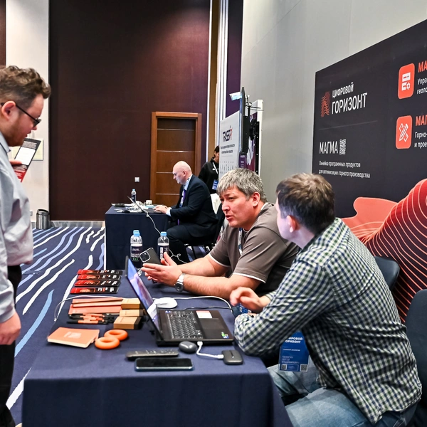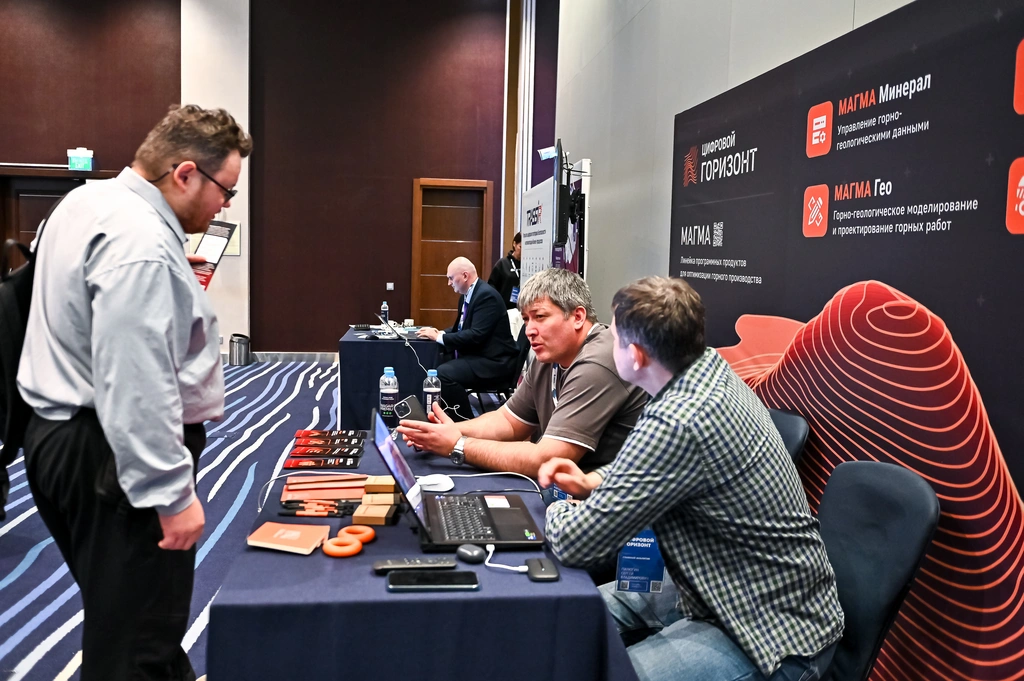 В рамках деловой программы директор проектного офиса ЦИФРОВОГО ГОРИЗОНТА Рустам Гогов выступил с докладом, посвященным повышению операционной эффективности управления горными работами. В своём выступлении он детализировал ключевые задачи, которые позволяет решить система МАГМА: синхронизацию планов по всей цепочке создания стоимости, онлайн-контроль производственной документации, оптимизацию взаимодействия техники и управление складскими остатками в реальном времени, а также стратегическое планирование, увязанное с рыночным спросом.